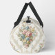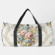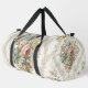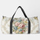 This image showcases a duffel bag featuring a rich and intricate floral tapestry pattern, reminiscent of lush Victorian gardens and antique textiles. The central design presents an abundant bouquet of blossoms in soft pinks, dusty blues, and muted yellows, intertwined with diverse green foliage. The background is a textured, light cream or off-white, subtly adorned with faint, elegant scrolling patterns that frame the vibrant floral centerpiece. Equipped with sturdy, dark-colored straps and a secure zipper closure, this bag is a functional yet exquisitely designed accessory, perfect for travel, gym use, or adding a sophisticated, old-world charm to any ensemble.