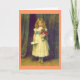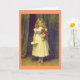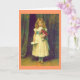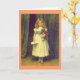 This card feature a young girl holding a card and some roses in her arms with a light oranber border .