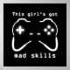 Gaming Game Controller Illustration mit - "Dieses Mädchen hat got verrückte Fähigkeiten". Zeige deine Leidenschaft für das Gaming ab! Dieses Bild von einem anderen Spieler erstellt. Schriftart OCR-A verwendet in diesem Design. Verwenden Sie die Schaltfläche Anpassen, um einen Namen oder eine Nachricht hinzuzufügen. Auch die Hintergrundfarbe kann geändert werden - anpassen > bearbeiten