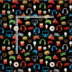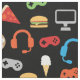 Videospiel-Party scherzt Gamer-Imbiss-Muster-Gewebe. Videospielprüfer-, -kopfhörer-, -pizza-, -schaumgummiring-, -burger-, -eiscreme- und -fischrogenmuster auf schwarzem Hintergrund. Spaß Gamer-Videospiel-Partymuster für Kinder. www.SamAnnDesigns.com