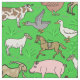 Dieser Spaß, wunderliches Vieh-Collagenmustergewebe zeigt ein Durcheinander der Haustiere/der Viehbestand, der in einer grünen grasartigen Landschaftslandschaft stehend ist. Die Tiere schließen Schweine, Kühe, Hühner, Ziegen, Schafe, Pferde, Kaninchen, Enten und Gänse mit ein. Die Art ist Art Vintages/Primitives mit einem Hand-gezeichneten Blick, aber nicht wirklich Cartoon Ähnliches.