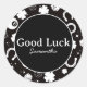 Viel Glück Aufkleber mit Schwarz-Weiß-Muster mit vierblättriges Kleeblatt, Kleeblatt, Hufeisen, Würfeln, Acht Ball. Sie verfügen über ein niedliches, anpassbares Bild und Text. Ideal für Einladungen und Party-Taschen.
