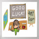 Ermutigen Sie, wenn Prüfungen mit dieser Viel Glück Exams Cartoon-Nachricht kommen. Für schwache Studentenprüfer - ein kleiner Spaß, um die Last zu verringern. Shows Klassenzimmer, Tafel mit Nachricht, "behalt ruhig" Tafel, Schüler am Schreibtisch und ein schöner Tag draußen.