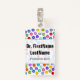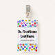 Dieses AbzeichenAusrüstungsbeschreibungslose Kreise/Punkte der verschiedenen Farben. Es kennzeichnet auch einen personalisierten Namen in Schwarzes farbigem Text innerhalb eines hellfarbigen Bereichs. Es gibt auch eine kundengerechte Mitteilung unter dem Namen dieses könnte Informationen wie eine Stellenbezeichnung zeigen oder ein Beruf oder ein Geschäft/ein Firmennamen. [~Z0000176]