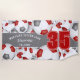 Dieses sportbezogene Strandhandtuch für Fußball-Spieler verfügt über eine Reihe verschiedener roter, grauer und weißer Fußballbälle, die auf weißem Hintergrund gedreht wurden - mit dem Namen und der Trikot-Nummer des Athleten sowie dem Namen des Teams und des Maskottchens - von katz_d_zynes
