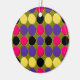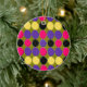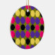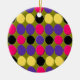 Dieser helle Anhänger ist mit lila, rosa gelben und schwarzen Flecken bedeckt, die in Reihen angeordnet sind, die durch dunkelgrüne Bereiche voneinander getrennt sind. Dieses fantastische abstrakte erinnert an eine Mauer, die nach einem Paintballspiel mit Farbtupfern bedeckt ist.