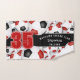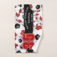 Dieses Teamgeist-Handtuch für Fußball-Spieler verfügt über unterschiedlich große rote und schwarze Mannschaftsfarben, die Fußball-Bälle auf weißem Hintergrund gedreht werden, mit prominenter Jerseynummer in rot mit einem schwarzen Farbstreifen in voller Länge, auf dem Sie auch den Namen, den Teamnamen und den Maskottnamen des Athleten in Weiß anpassen können - von katz_d_zynes