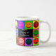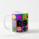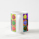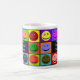 Diese Tasse kennzeichnet 10 bunte glückliche Gesichter, welche die Phrase "viele Stimmungen des Koffeins umgeben", das auf Seiten für Lefties oder Righties gedruckt wird!