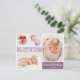 Modern, Girly Lilac und Mauve Vielen Dank Baby Birth Ankündigung 4 Foto Collage Postkarten. Elegantes, niedliches Foto-Geburt-Ankündigungsformular mit vier (4) Ihrer Lieblings-Baby-Fotos mit einem hübschen handgeschriebenen Skript in Weiß auf Pastelllila oder leicht lila und violett oder staubigen Pflaume lila Farbblöcke. Fügen Sie den Namen Ihres Babys, danke Nachricht und Geburtsdaten hinzu. Einfach zu personalisieren.