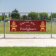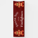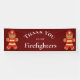 Ein Banner mit bordeauxfarbenem Hintergrund und weißem Text. Es steht "Danke an unsere Feuerwehrleute" und beinhaltet einen Lebkuchen-Feuerwehrmann auf jeder Seite. Der Text ist benutzerdefinierbar und die Feuerwehrleute sind so wertvoll.