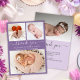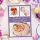Baby Birth Lila Ankündigung Vielen Dank Foto Collage Cards. Elegante minimalistische niedliche Geburtsankündigung mit 3 Ihrer Lieblings-Baby-Fotos vorne, mit einem hübschen handgeschriebenen Text "Danke" in einer Wirblen Kalligraphie-Skript mit Swash-Schwänzen auf lila oder lila Hintergrund. Fügen Sie den Namen Ihres Babys auf der Vorderseite und die Geburtsdaten hinzu. Auf der Rückseite gibt es Platz für Ihre Danksagung und ein Baby-Foto. Man kann es leicht personalisieren.