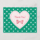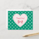 Ein niedliches Dankeschön an die Postkarte mit einem smaragdgrünen Polka-Punktmuster und einem herzförmigen Pflaster in Rosa, geschmückt mit einem hübschen rosa Band. Flachbild, nicht eigentlicher Bogen.