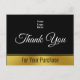 An der Vorderseite steht ein elegantes weißes Skript mit dem Text "Danke" in der Mitte der Postkarte. Unten befindet sich ein schwarzer Bildschirmtext, den Sie bearbeiten können (angezeigt: Für Ihren Einkauf). Der schwarze Text ist auf einem goldenen Streifen. Oben befindet sich ein Display, das durch Ihr Firmenlogo ersetzt werden kann. Auf der Rückseite sehen Sie einen Anzeigetext für die Rücksendeadresse und Zeilen für die Adresse des Empfängers. Alle Texte können bearbeitet oder gelöscht werden. Das Imitat Gold ist eine künstlerische Darstellung (d.h. es ist keine Folie). Diese Postkarte hat keine Minimen.
