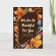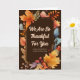 Wir sind Ihnen so dankbar. Schöne dunkelbraune Erntedank-Karten für ein Geschäft, um den Kunden ihre Dankbarkeit während der Feriensaison zu schicken. Passen Sie Ihren Firmennamen in der Aquarellwalbe von orangefarbenen Blätter an. Benutzerdefinierte Nachricht im Inneren für Herbst Marketing.