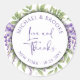 Vielen Dank Liebe und Dank Elegant Lila Blumenschrift Wedding Stickers Labels bietet Ihre personalisierten Namen, Hochzeitsort und Hochzeitsdatum mit dem Text "Liebe und Dank" in moderne lila Kalligraphie Drehbücher Typografie umgeben von eleganten Wisteria Blume. Ideal für Hochzeiten, Verlobungsfeiern, Jubiläum, Geburtstag, Veranstaltungen und Feiern, Quinceanera, Babydusche, Brautpartys und vieles mehr. Von Evco Studio entworfen www.zazzle.com/store/evcostudio