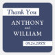 Das moderne marineblaue Hochzeitsdesign umfasst weiße geometrische Farbblöcke, die sich vom oberen links mit den Worten "danke" und vom unteren rechten mit dem Datum in marineblau kursiv ausstrecken. Die Namen der Paare sind in der Mitte in weißem Text. Personalisieren Sie das Design in der Sidebar. © Claire E. Skinner, Alle Rechte vorbehalten.