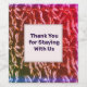 Wir bedanken uns für Ihre Feriengäste mit diesem hellrosa und lila Weinflaschenlabel. Die Mitte ist lebhaft rosa mit lila Highlights am Boden, mit einem gekräuselten abstrakten Muster, das an geknitterte Folie oder Flüssigmetall erinnert, das sich bei Abkühlung gefaltet und zerknittert hat. Schnell und einfach die Worte "danke, dass du mit uns bleibe hast", die in der Mitte dieses ausgeklügelten Flaschenetiketts erscheinen, an ein hellrosa Rechteck anpassen. Original Design C. McGouldrick