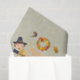 Gewebepapier mit einer Erntedank-Abbildung - ein Pilger und gebürtig mit vielen Erntedank-thematischen Zeichnungen. Ein Tisch mit einem herrlichen Truthahnfest, Herbstblättern und Kranz. Text sagt vielen Dank. Set auf einem bräunlichen Hintergrund mit einem Damast-Muster.