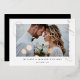 Ein zeitloses, klassisches und elegantes Hochzeitskartentchen mit einer modernen minimalen Ästhetik in klassischem Weiß & Schwarz mit echten Folienakzenten. Einfaches, elegantes Wappen aus echter Folie mit einfacher Typografie in modernem Layout. Benutzerdefiniertes Foto, das Paarmonogramm und die personalisierte Meldung auf der Rückseite. **Alle Farben können in Anzug Ihrer Hochzeitsfarbenpräferenz geändert werden. Karo unsere anderen passenden Hochzeitsartikel für diese Kollektion heraus.