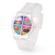 Eine super niedliche Uhr mit vier bezaubernden, farbenfrohen Kuchen mit Regenbogen, Blume, Herzen, Schmetterlingen, Einhörnern und mehr, jedes mit einem hellen Hintergrund. Es ist das perfekte Geschenk für ein Mädchen. Die Kunst stammt aus dem sehr beliebten Spiel "My Cupcake Bakery".