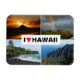 Rechteckiger Kühlschrankmagnet mit einer Andenken-Collage von 4 Fotos der wunderschönen Natur auf den Inseln Oahu, Kauai und Maui mit einem Sonnenaufgang am Strand von Lanikai, einem Regenbogen über Kilauea Lighthouse, einem schwarzen Sandstrand am Waianapanapa Staat Park entlang der Straße nach Hana und der Na Pali Küste und dem Text: "I Liebe Hawaii" mit einem Rot Herz.