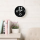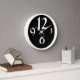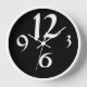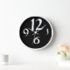 Eine große, runde Uhr mit nur vier sehr großen funky Zahlen, 3, 6, 9 und 12, in Weiß auf schwarzem Hintergrund.