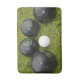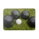 Auf grünem Gras sind vier schwarze Rasenschüsseln und Jack abgebildet