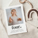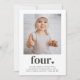 Eine moderne 4. Geburtstagsveranstaltung mit eigenem Foto und dem Wort "Vier" mit Herzenslust darunter. Sie können auch alle Textfarben und -stile sowie die Herzfarbe bearbeiten, wenn Sie gewollt haben. Klicken Sie einfach auf die Schaltfläche 'Personalisieren' -> 'Bearbeiten mit dem Designwerkzeug'.