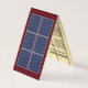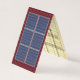 Vierseitige, gefaltete Visitenkarte mit einem ganzen Dach, außen mit roten Dachziegeln und Sonnenkollektoren. Innen mit Holz verkleidet wie ein echtes Dach. Es ist genug Platz für die Anzeige Ihrer Dienste. Perfekt für Unternehmen der Solartechnik, Firmen der Solartechnik, Pflanze, Solarenergiesysteme, Fotovoltaik-Systemgeschäft, Solardach-Blei, Dachinstallateure, Solarinstallateure.