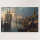 The glowing sunset lighting enhances depth and atmosphere, casting long reflections across the water and illuminating the busy scene with cinematic warmth. Perfect for fans of Viking history, Norse mythology, and detailed historical artwork, this jigsaw puzzle offers both a rewarding challenge and a striking finished display.