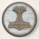 Ein Qualitätssandstein-Untersetzer, der den klassischen Hammerentwurf des Thors über schön verwittertem hölzernem Wikinger-Schildhintergrund kennzeichnet.