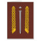 In dieser originalen Illustration von Richard H. Fay wird ein Schwert aus der Wikingerzeit (frühmittelalterlich) mit einem Trilobatpommel dargestellt, das auf einer im Britischen Museum untergebrachten, zwischen zwei Plastikbändern auf der Grundlage eines Designs aus einer Viking Age Steinskulptur auf der Isle of Man gezeigt wird.