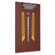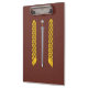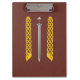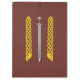 In dieser originalen Illustration von Richard H. Fay wird ein Schwert aus der Wikingerzeit (frühmittelalterlich) mit einem Trilobatpommel dargestellt, das auf einer im Britischen Museum untergebrachten, zwischen zwei Plastikbändern auf der Grundlage eines Designs aus einer Viking Age Steinskulptur auf der Isle of Man gezeigt wird.