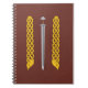 In dieser originalen Illustration von Richard H. Fay wird ein Schwert aus der Wikingerzeit (frühmittelalterlich) mit einem Trilobatpommel dargestellt, das auf einer im Britischen Museum untergebrachten, zwischen zwei Plastikbändern auf der Grundlage eines Designs aus einer Viking Age Steinskulptur auf der Isle of Man gezeigt wird.