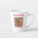 Diese Latte Tasse hat einen Viktorianischen kleinen Engel in einem roten Kapuzenumhang mit einem verzierten Weihnachtsbaum gekleidet und präsentiert sich auf einem bräunlichen Hintergrund mit fallendem Schnee in einem verzierten roten Rahmen. Passen Sie den frohen Weihnachtstext oben mit der Vorlage an.