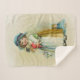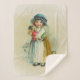Diese Sherpa-Fleecedecke ist eine beige Farbe, die nach Weiß verblasst. Ein kleines Mädchen aus der Viktorianischen Zeit trägt einen blauen Hut, der eine Puppe mit mehr Puppen und einem Puppenhaus zu ihren Füßen hält.