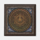 Eine gerahmte Barockuhr aus Holz mit Blüten, Blume und Pflanze in Blau, Grün und Rosa. Der Rahmen ist dunkelbraun. Die Uhr ist in der Mitte des Rahmens, hat ein Metall-Look in Messing und ist sehr detailliert und dekorativ mit goldenen Zahlen.