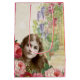 Dieses Viktorianische Design besticht durch ein weibliches Gesicht, das vor einem Aquarellhintergrund mit einer Eingangstür und Stufen und einer farbenfrohen Blume ringsherum steht. Die Frau hat auch rote und rosa Rosen.