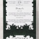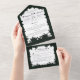 Alles in einer dreiseitigen Hochzeitseinladung mit einem dunkelgrünen Viktorianischen Design mit dekorativen Blume. Hochzeitseinladung, rsvp Karte mit Essensauswahl, Details und Umschlag Kombination.