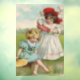 Diese süßen kleinen Mädchen machen eine Pause, um ihre heißen Füße zu trinken. Das ist eine schöne Abbildung aus dem späten 19. Jahrhundert, als Kinder im Garten in hübscher Kleidung spielten.