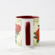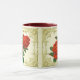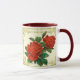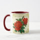 Vintages Viktorianisches Kunstdesign aus roten Cabbage-Rose auf einem Hintergrund von cremefarbenen Spitzen in einem goldenen Rahmen. Sie wählen die Tasse und die Farben aus oder fügen Ihren eigenen Text hinzu.