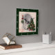 Weihnachtsuhr mit einer Weihnachtsfensterszene des Weihnachtsbaumes und Lichtern, die nachts durch ein schönes Fenster, grüne Kante und hervorgehobene Zahlen leuchten.