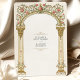 Diese Viktorianische Hochzeitseinladung besticht durch einen großen goldenen Bogen, der mit Reben aus rosa Rosen und einer zarten Vegetation geschmückt ist. Die aufwändigen Blumendetails und das klassische Säulendesign strahlen zeitlose Eleganz und romantischen Charme aus. Ideal für Paare, die eine Vintag inspirierte Hochzeitsstätte mit einer luxuriösen Ästhetik und einer Touch von Blumeneleganz suchen.