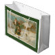 Eine Geschenktasche mit einem Vintagen, grün verkleideten Viktorianischen Weihnachtsmann, der im Schnee durch das Dorf spaziert und einen Tannenbaum trägt. Diese Abbildung wird digital wiederhergestellt und aus einer deutschen Postkarte, die ursprünglich vor 1923 veröffentlicht wurde, weiterentwickelt.