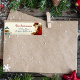 Nostalgisches Bild eines rot-roten Weihnachtsmannes aus der Viktorianischen Zeit, der eine Tüte Spielzeug trägt, das einen Brief von einem schüchternen Kind in blauer Mantel und Hut bekommt.