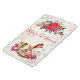 Bei Christmas flex=magnet. The background is a vintage stil collage with a faded image of pink roses, green leaves and french writing. Layered over top is a pretty poinsettia christmas bouquet and a victorian rocking horse surrounded with pretty pink peonies and posies.