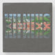 Vilnius Text aus Blick von oben von Vilnius Altstadt, Litauen. Aussicht auf die Kathedrale St. Stanislaus auf dem Domplatz, Schloss Gediminas auf dem Hügel, rote Dächer