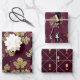 Deep burgundy - weinrot und goldglänzend gemustertes Vintages Packpapier in drei verschiedenen Rotwein-Stilen inklusive Trauben, einer französischen Dame und Weingläsern in Gittermuster.