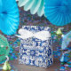 Vintages Azulejo Tile Muster in Blau und Weiß transportiert zur Oberfläche einer modernen Gefälligkeitsbox, unter Wahrung seiner Geschichte und Tradition. Azulejo ist eine Form von portugiesischer oder spanischer Malerei, mit Zinn-Glasur, Keramik Fliesen. Es ist zu einem typischen Aspekt der portugiesischen Kultur geworden. Portugal importierte Azulejo-Fliesen aus Spanien, und ihre Verwendung war in religiöser und privater Architektur weit verbreitet, insbesondere auf Fassaden.