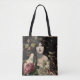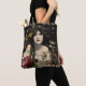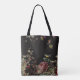 Eine ganz besondere Vintage inspirierte Tasche mit einem wunderschönen Frauenportrait, umgeben von Blume, Vögeln, Bienen, Beeren und windgekehrten Blätter auf elegantem schwarzen Hintergrund. Dieses einzigartige Carry-All ist so robust und praktisch wie romantisch und schön. Macht ein nachdenkliches Geschenk.